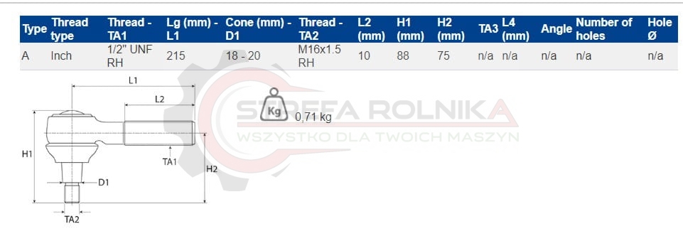 KOŃCÓWKA DRĄŻKA MASSEY FERGUSON 230, 240, 253, 340, 342, 350, 352, 355, 360, 362, 362N, 372N, 4215, 4220, 4315, 4320, 3443036M91