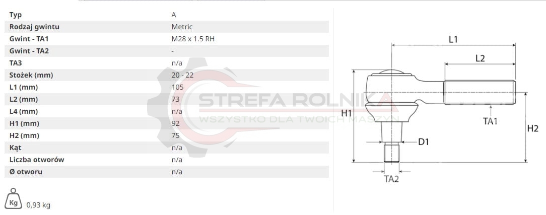 KOŃCÓWKA DRĄŻKA MASSEY FERGUSON 230, 240, 253, 340, 342, 350, 352, 355, 360, 362, 362N, 372N, 4215, 4220, 4315, 4320, 3475946M91, 3901825M91