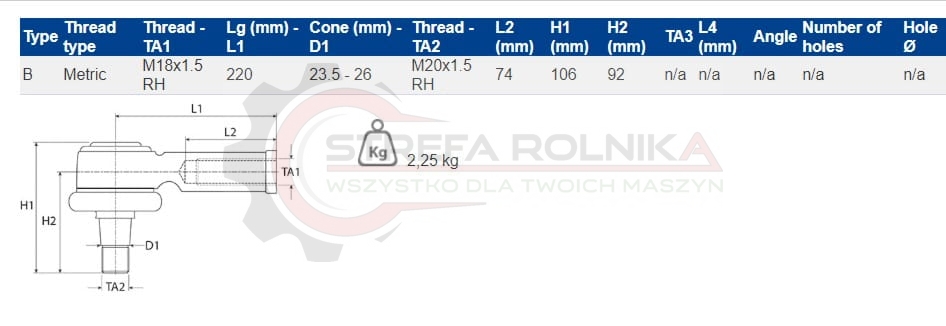 KOŃCÓWKA DRĄŻKA MASSEY FERGUSON 365, 375, 375E, 390, 390E, 396, 4225, 4225HV, 4235, 4235HV, 4240, 4245, 4245HV, 4255, 4255HV, 4260, 4265, 4270, 6110, 6120, 6130, 6140, 3764027M2