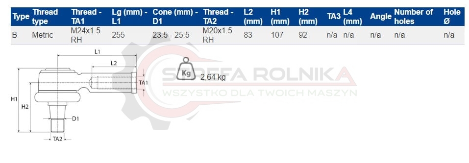 KOŃCÓWKA DRĄŻKA MASSEY FERGUSON 6260, 6270, 6280, RENAULT ARES 153326517, 183677A1, 3903691M1, 477297, 6000103324, 6194011M91, 710541