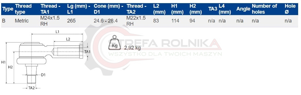 KOŃCÓWKA DRĄŻKA PRAWA JOHN DEERE 6320, 6320L, 6420, 6420L, 6420S, 6520L, 7425, 7525, 7210, 7410, 7220, 7320, 7420, 7520, 8430T, 8530, 9230, T400, T810 AL110886, AL116741, AL168709