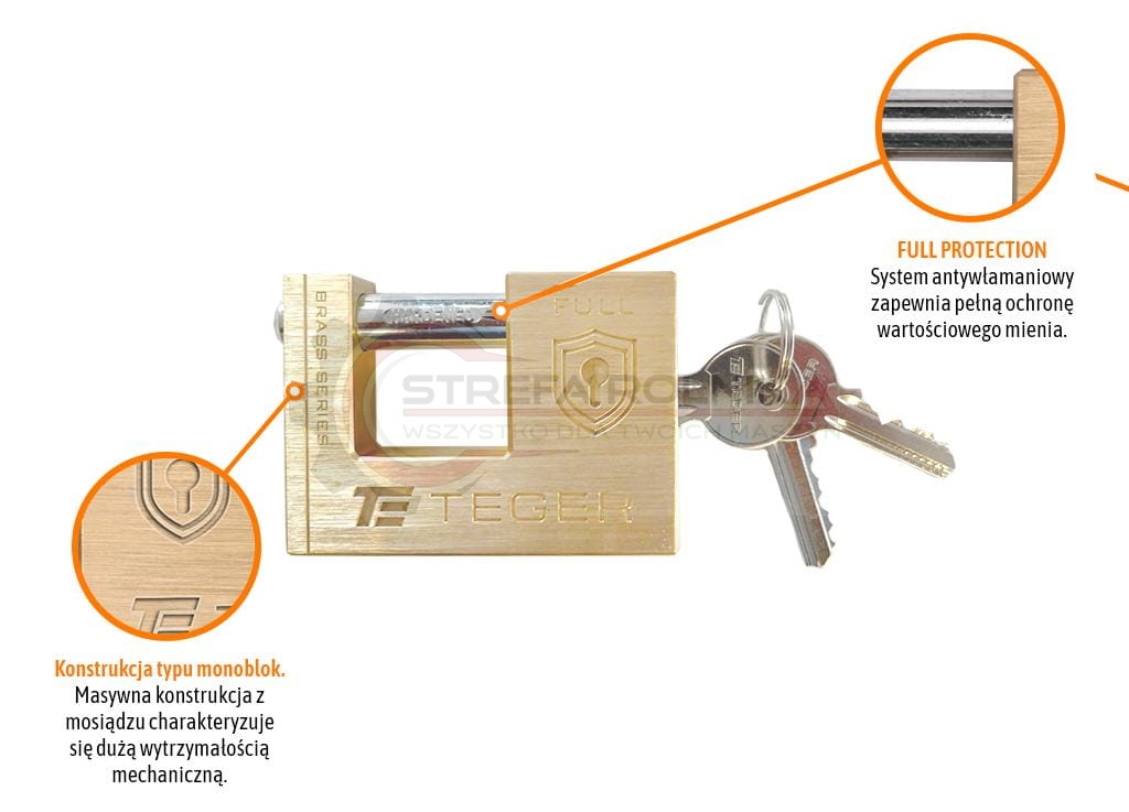 Kłódka antywłamaniowa - mosiężna / trzpieniowa 60mm - 3 klucze / TEGER wysokiej jakości kłódka antywłamaniowa z hartowanym niklowanym trzpieniem ze stali, korpus kłódki z litego mosiądzu o zwiększonej odporności na korozję i warunki atmosferyczne. Charakteryzuje się dużą wytrzymałością, przeznaczona do zastosowania przy ochronie wartościowego mienia. W zestawie 3 kluczyki.