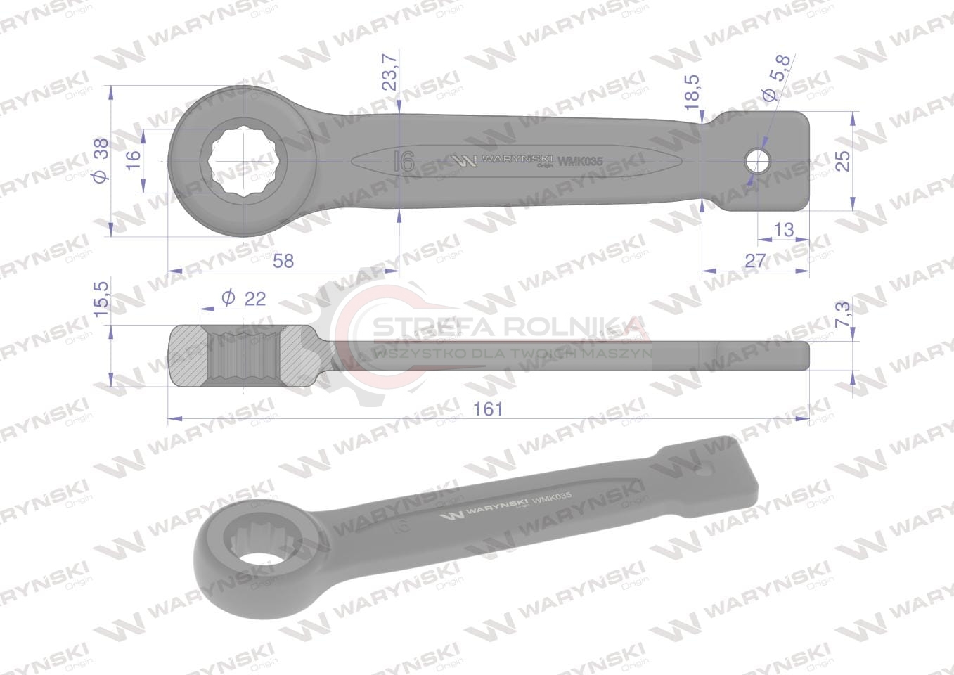 Klucz oczkowy 16 mm do pobijania ze stali wysokoudarnej CrMo DIN7444 Waryński