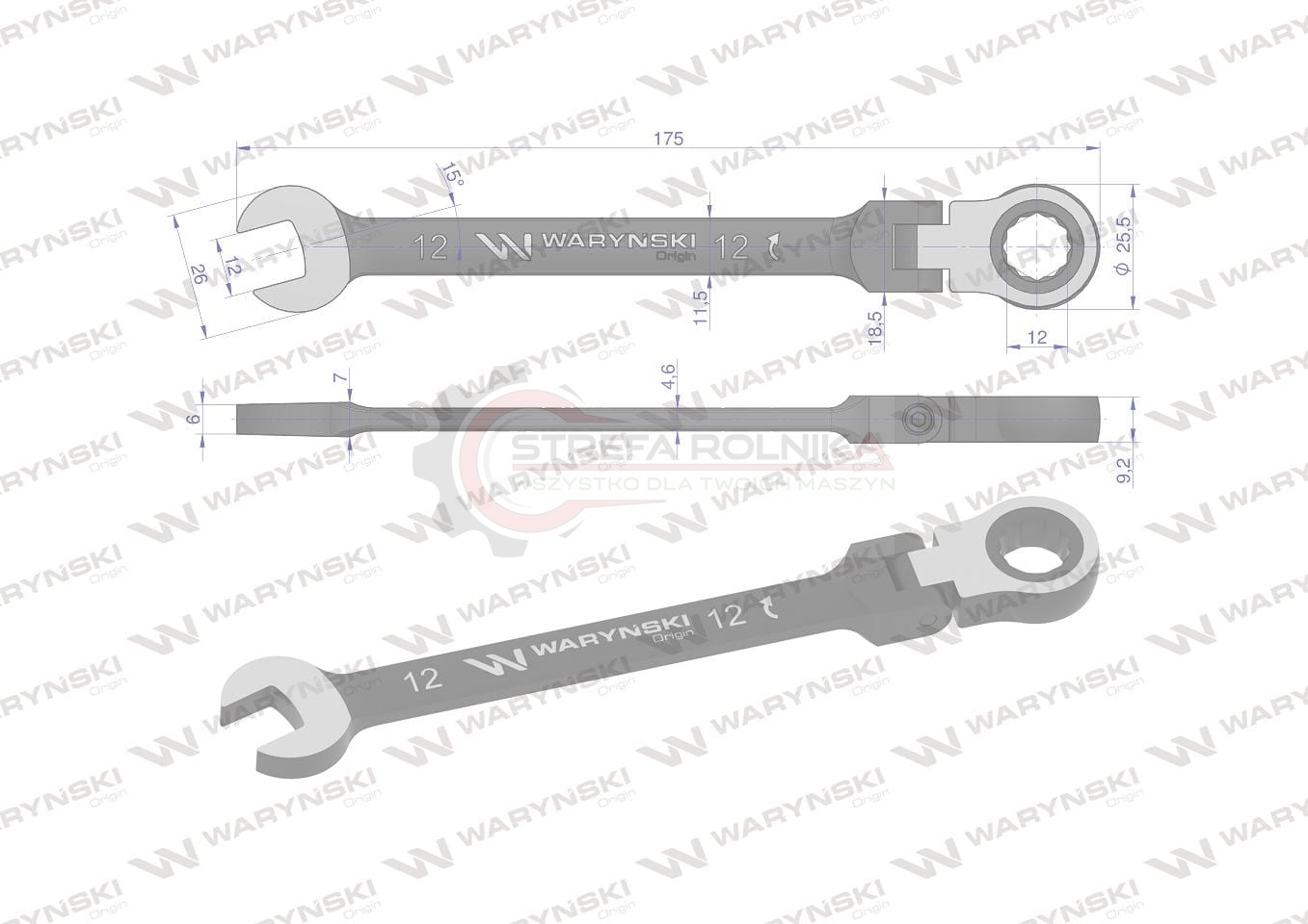 Klucz płasko-oczkowy 12 mm z grzechotką 72 zęby i przegubem Waryński