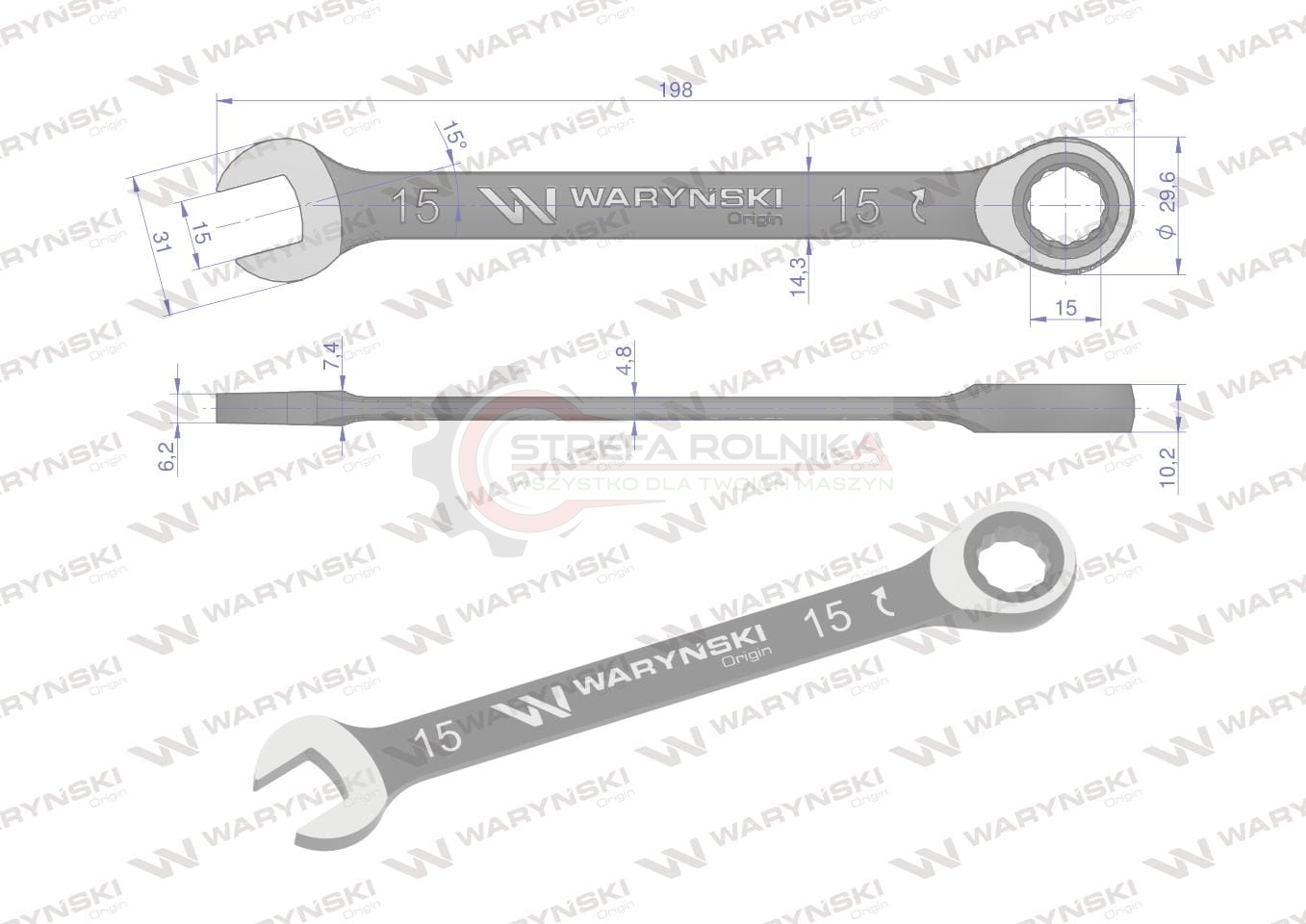 Klucz płasko-oczkowy 15 mm z grzechotką 72 zęby standard ASME B107-2010 Waryński