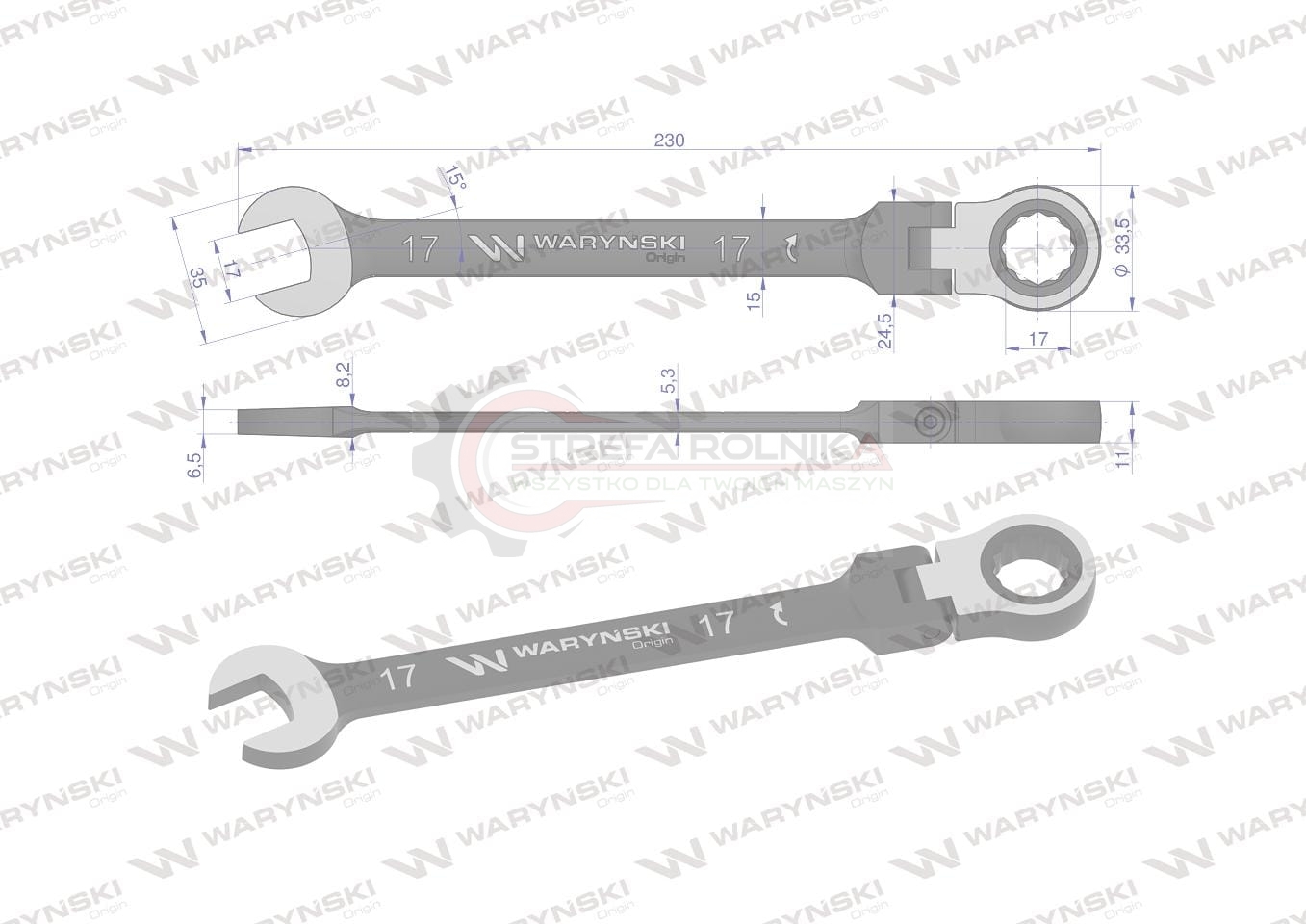 Klucz płasko-oczkowy 17 mm z grzechotką 72 zęby i przegubem Waryński