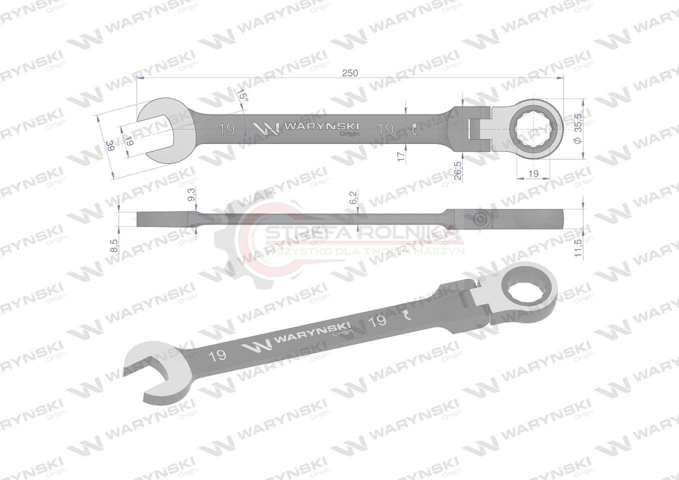 Klucz płasko-oczkowy 19 mm z grzechotką 72 zęby i przegubem Waryński