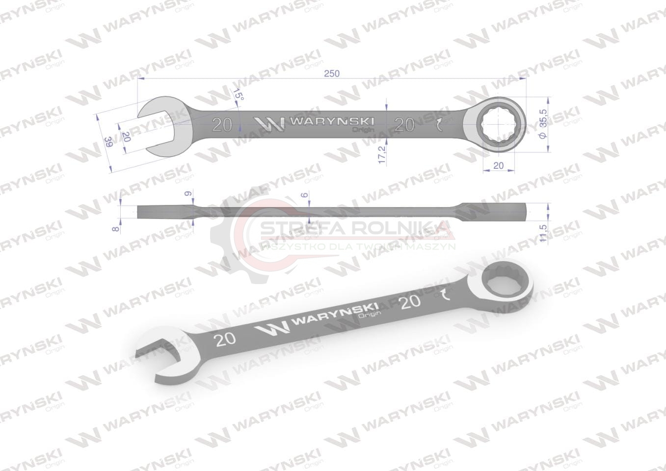 Klucz płasko-oczkowy 20 mm z grzechotką 72 zęby Waryński