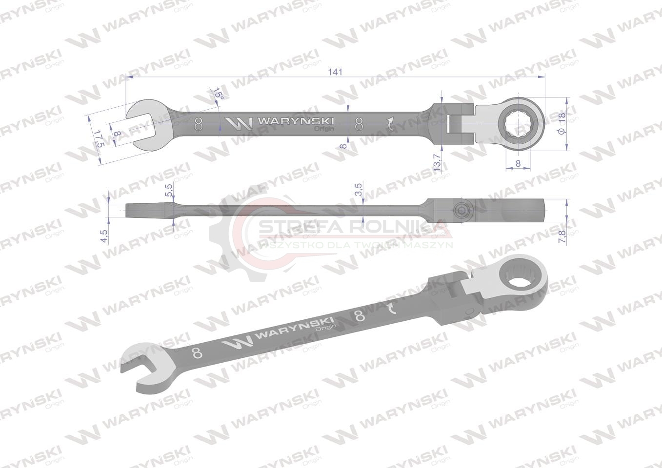 Klucz płasko-oczkowy 8 mm z grzechotką 72 zęby i przegubem Waryński
