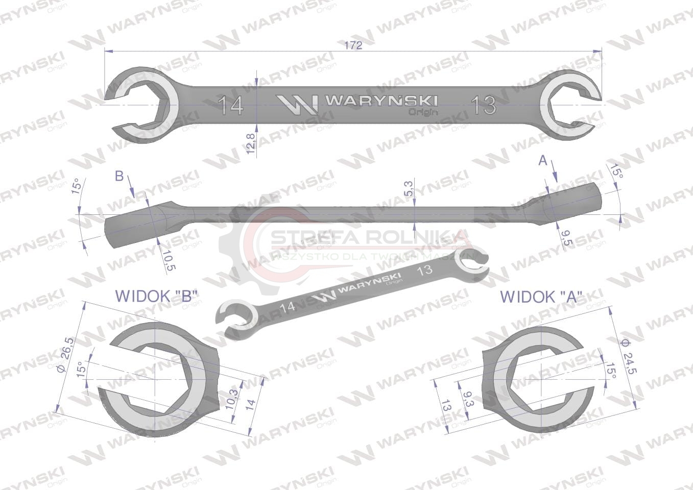 Klucz płasko oczkowy otwarty 13 x 14, Waryński