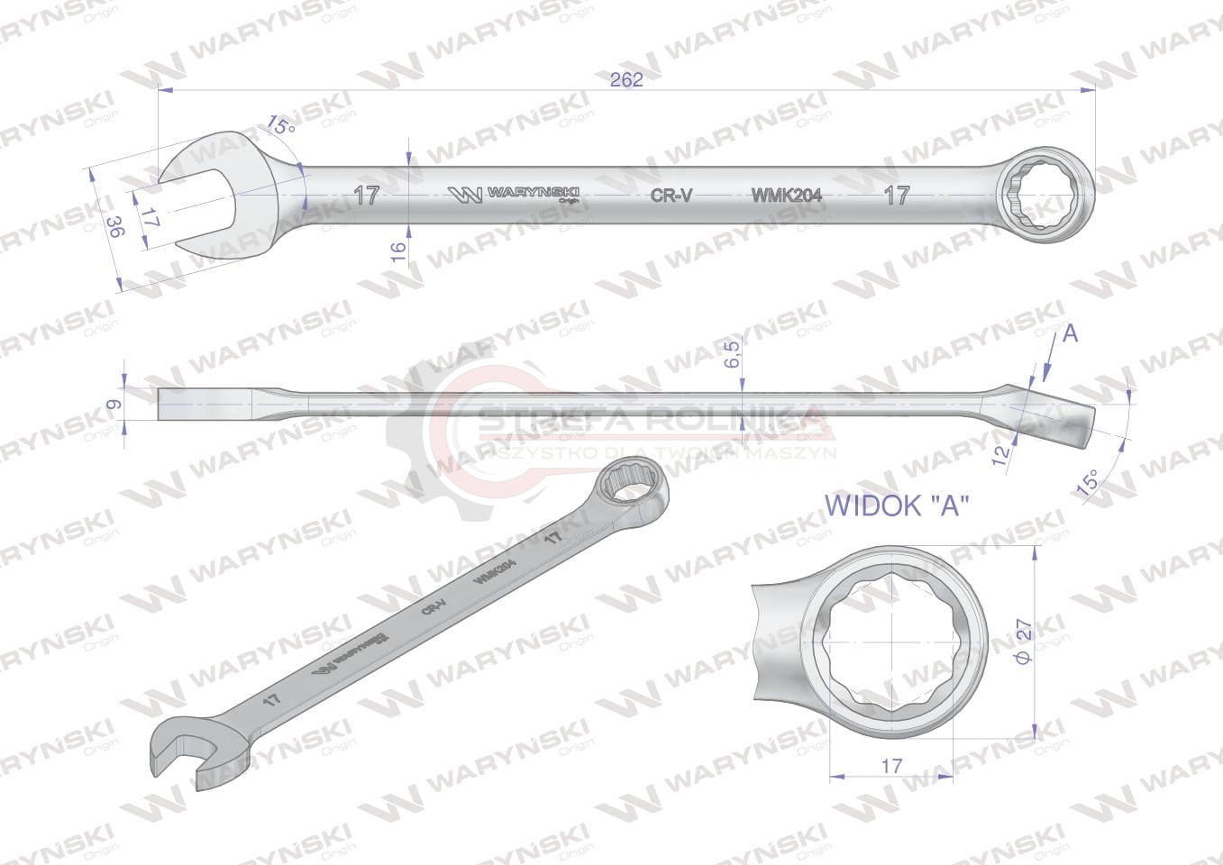 Klucz płaskooczkowy extra długi 17mm dł 262mm standard ASME B107.9M Waryński