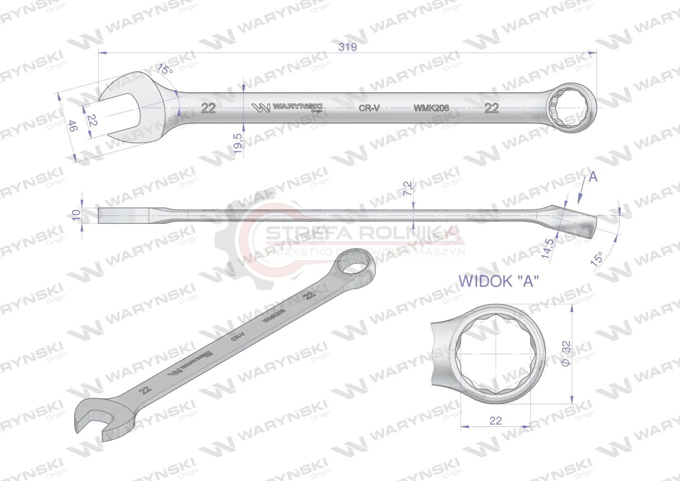 Klucz płaskooczkowy extra długi 22mm dł 319mm standard ASME B107.9M Waryński