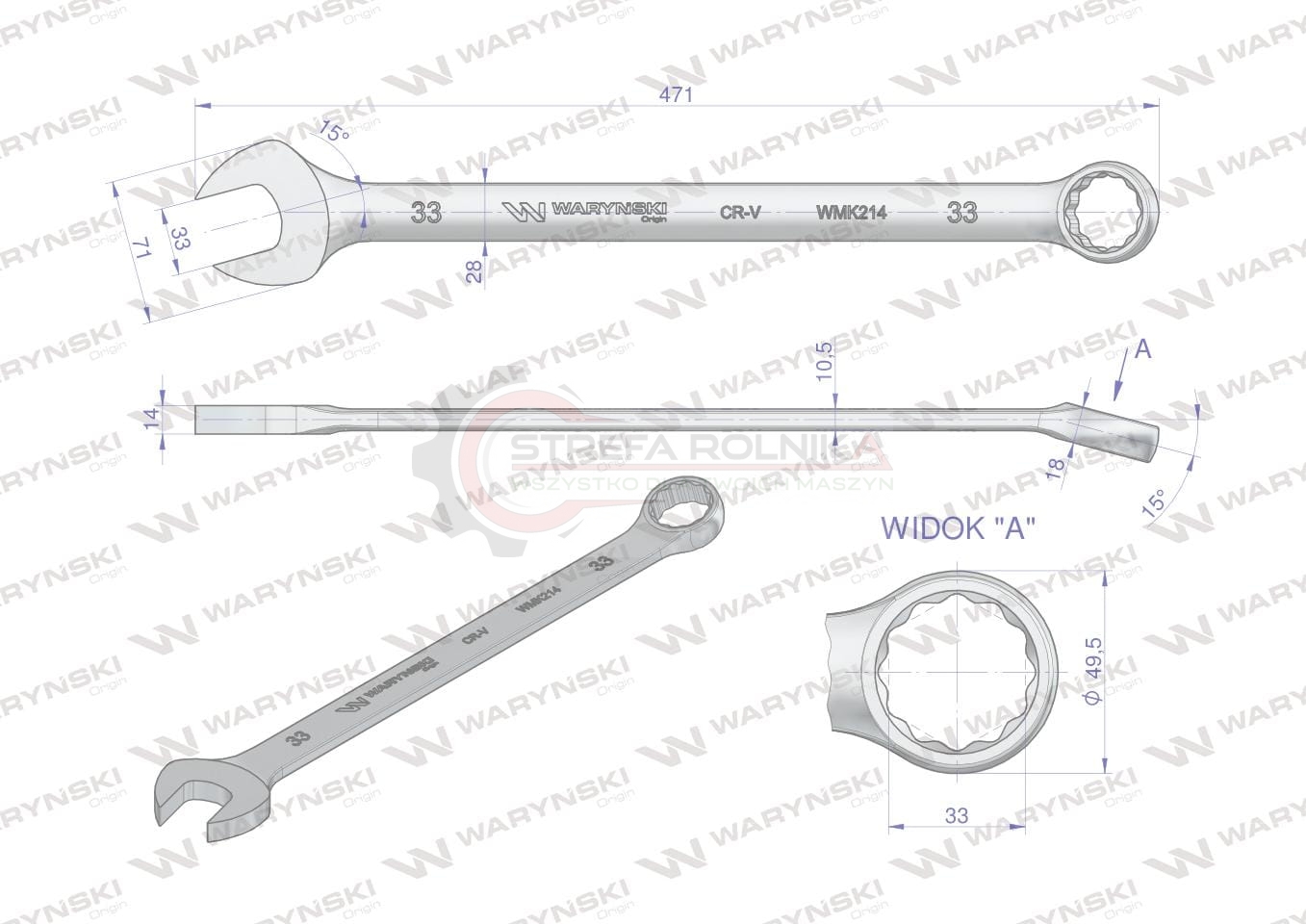Klucz płaskooczkowy extra długi 33mm dł 471mm standard ASME B107.9M Waryński