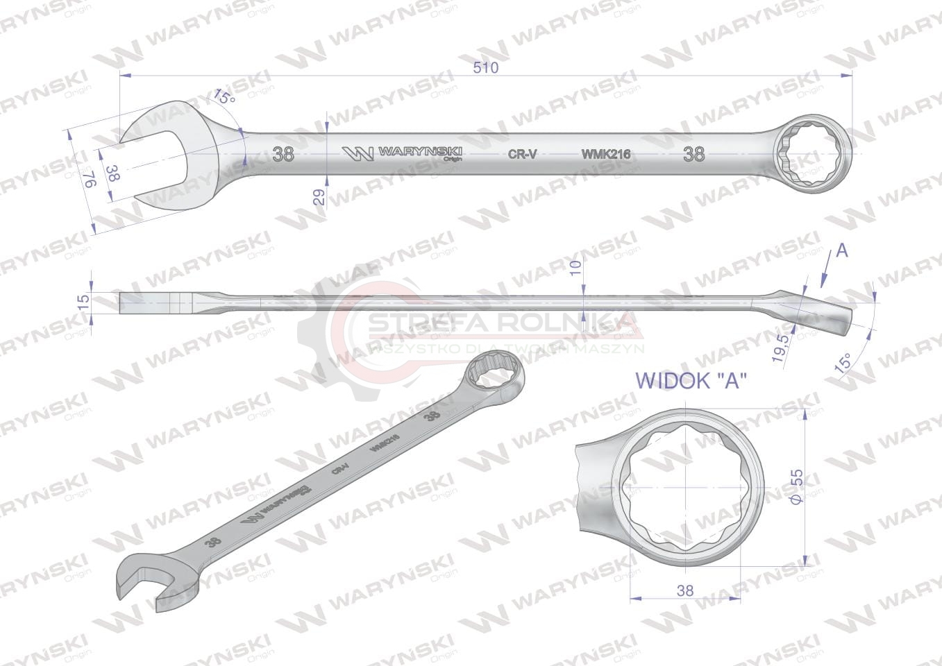 Klucz płaskooczkowy extra długi 38mm dł 510mm standard ASME B107.9M Waryński