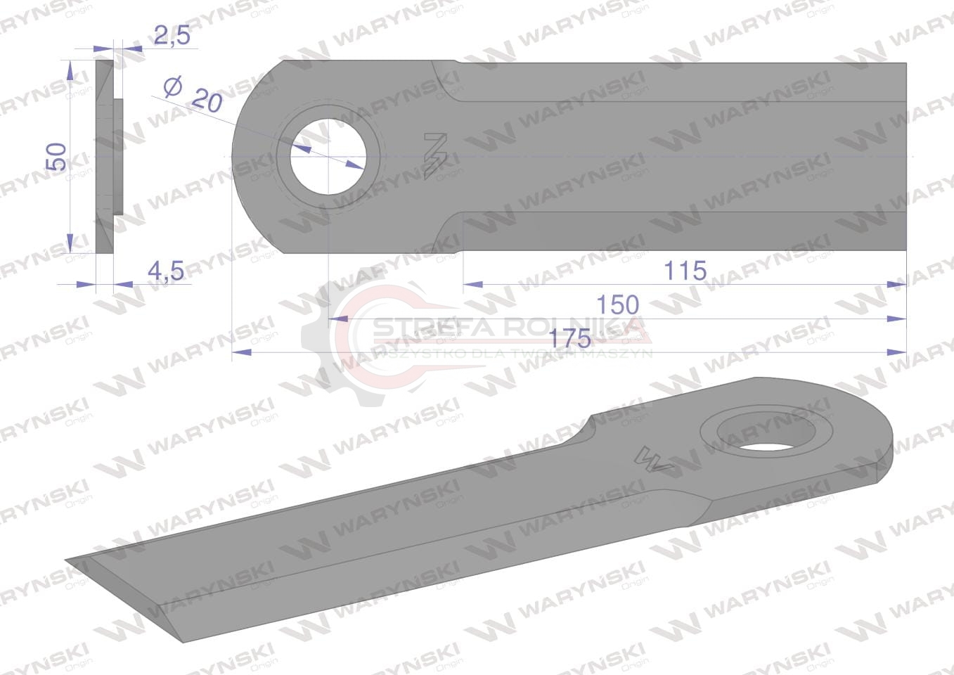 Nóż obrotowy sieczkarnia gładki 175x50x4.5mm otwór 20 z tuleją zastosowanie 1994760C4 Case WARYŃSKI ( sprzedawane po 25 )