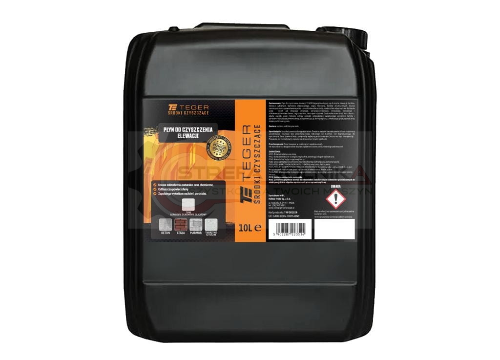Płyn do czyszczenia elewacji / TEGER to preparat który nadający się do mycia elewacji, dachów, elewacji szklanych, kamienia elewacyjnego, cegły, klinkieru, tynków strukturalnych. Usuwa zanieczyszczenia spowodowane przez czynniki atmosferyczne z powierzchni odpornych na działanie wody takich jak elewacje akrylowe, akrylowo-silikonowe, silikonowe, silikatowe i silikatowo-silikonowe, beton, cegła, marmur, tworzywo sztuczne. Doskonale usuwa brud, kurz, tłuszcz, plamy, zacieki, osad, różnego rodzaju wykwity jednocześnie zapobiegając wykwitom mchów i porostów. Odtłuszcza powierzchnię, przygotowując ją do impregnacji, zwiększając przyczepność oraz skuteczność impregnatu. Usuwa zanieczyszczenia spowodowane przez czynniki atmosferyczne z powierzchni odpornych na działanie wody takich jak elewacje akrylowe, akrylowo-silikonowe, silikonowe, silikatowe i silikatowo-silikonowe, beton, cegła, marmur, tworzywo sztuczne.