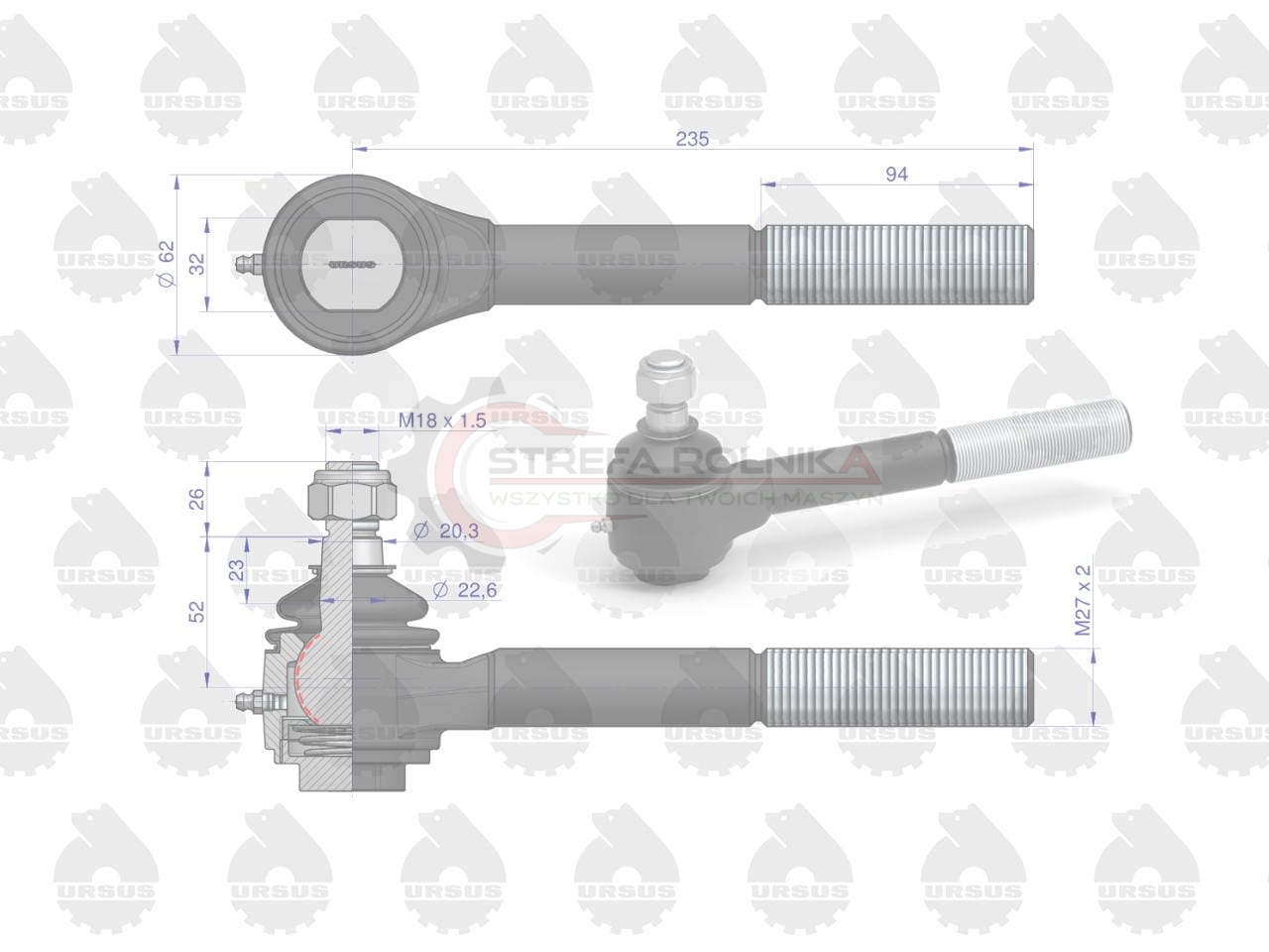 Przegub kulowy długi prawy gwintowany z nakrętką C-385 ORYGINAŁ URSUS