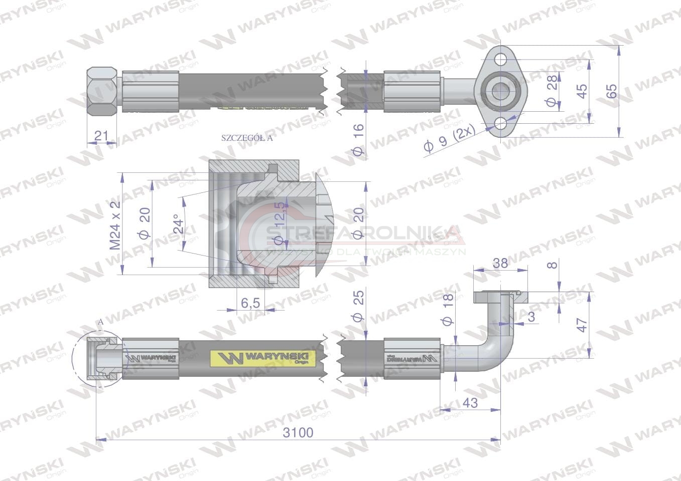 Przewód hydrauliczny Waryński 250 bar (25 MPa) - elastyczny, wielofunkcyjny zakuty przewód wzmocniony pojedynczym oplotem z drutu stalowego długi do Bizon. Sprawdzany ciśnieniem pulsacyjnym (medium: olej hydrauliczny). Przewód hydrauliczny Waryński ma na zakutych końcówkach zabezpieczenia w postaci żółtych korków. Dzięki temu do środka przewodów nie dostają się żadne zanieczyszczenia, które mogłyby wpłynąć na uszkodzenie elementów roboczych układu hydraulicznego. Wszystkie korki są gwintowane i wkręcane na odpowiedni rodzaj końcówki przewodu hydraulicznego.