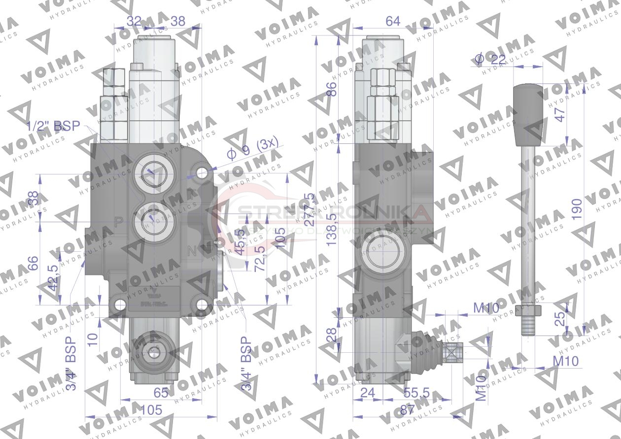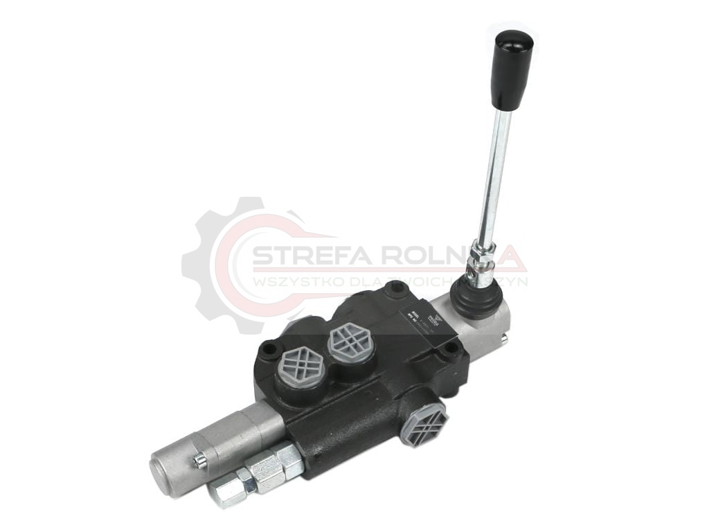Rozdzielacz hydrauliczny 1-sekcyjny 80L z sekcją pływającą VOIMA - monoblokowy z układem równoległym z neutralną pozycją środkową. Olej w pozycji neutralnej krąży między pompą hydrauliczną a zbiornikiem. Sekcja: pływająca (z zatrzaskiem).