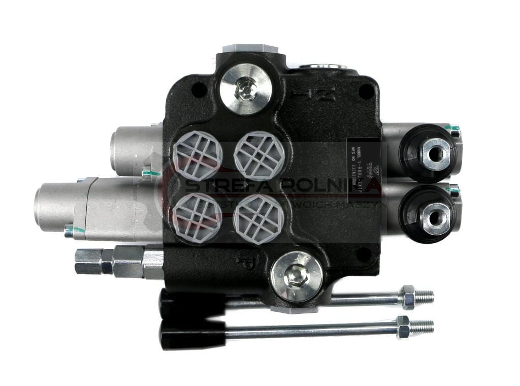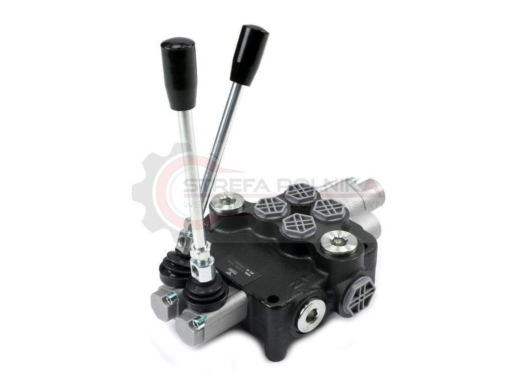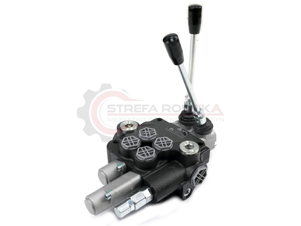 Rozdzielacz hydrauliczny 2-sekcyjny 80L (1-sekcja pływająca) VOIMA - monoblokowy z układem równoległym z neutralną pozycją środkową. Olej w pozycji neutralnej krąży między pompą hydrauliczną a zbiornikiem. Jedna sekcja: pływająca (z zatrzaskiem).