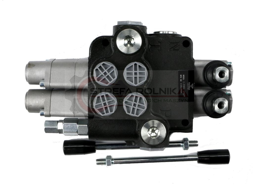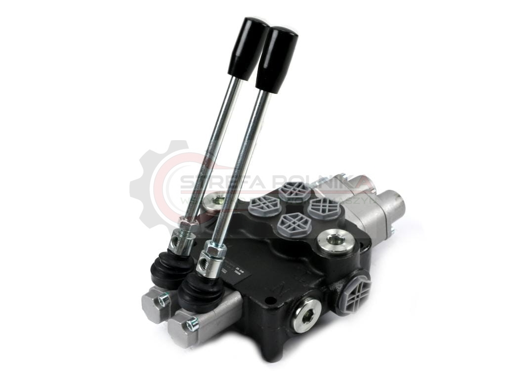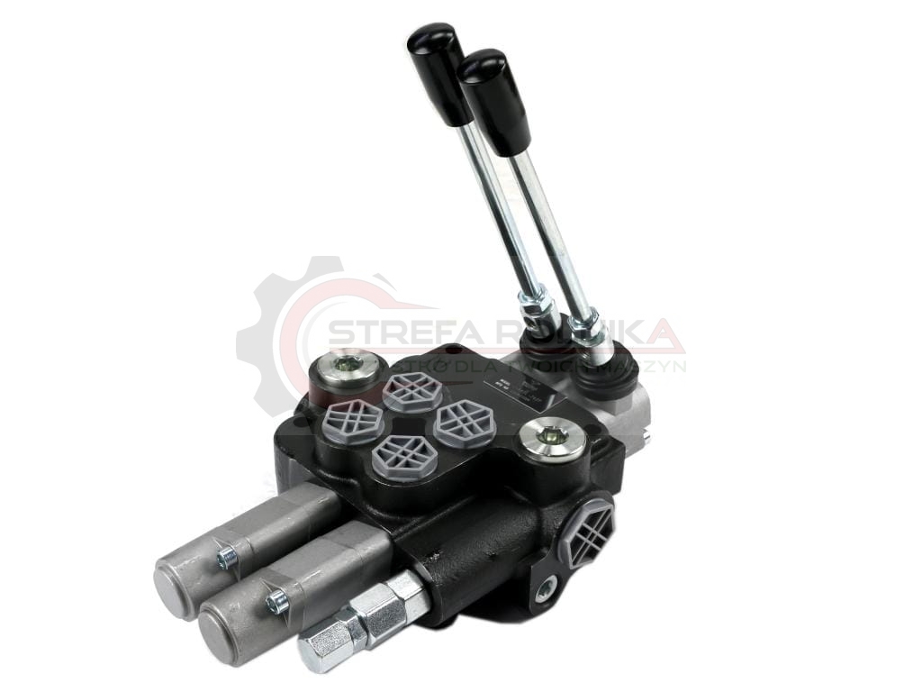 Rozdzielacz hydrauliczny 2-sekcyjny 80L (2 sekcje - pływające) VOIMA - monoblokowy z układem równoległym z neutralną pozycją środkową. Olej w pozycji neutralnej krąży między pompą hydrauliczną a zbiornikiem. Sekcje pływające (z zatrzaskiem).