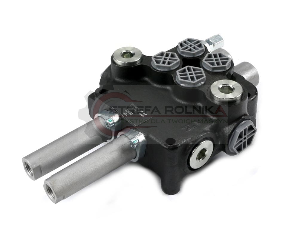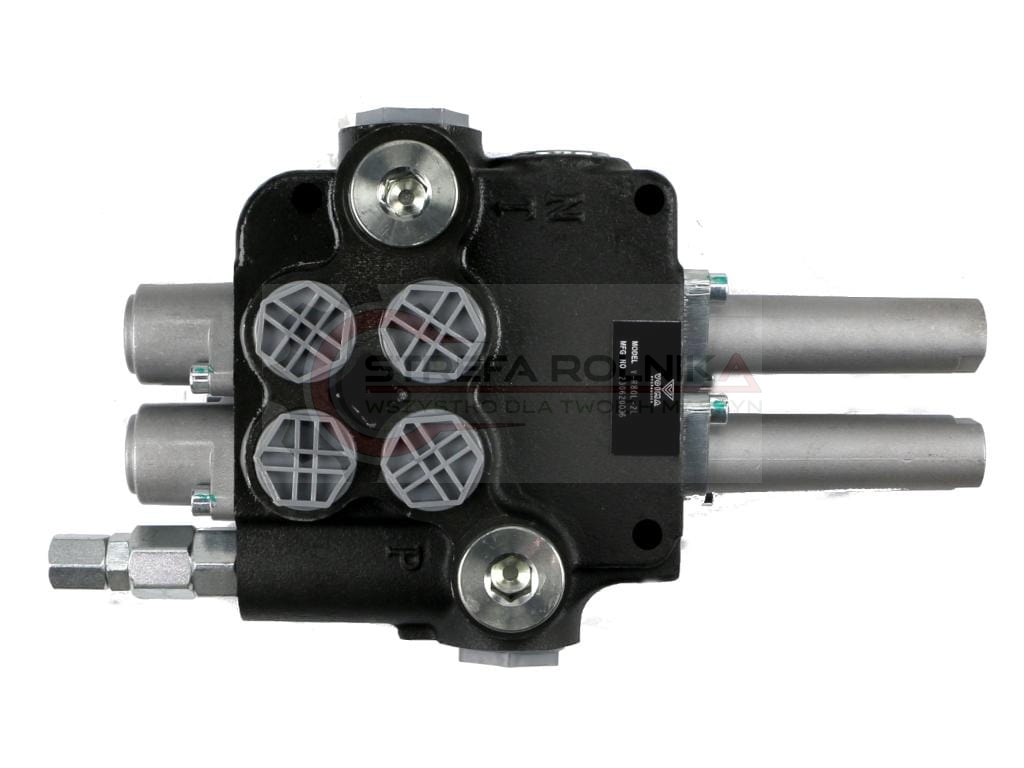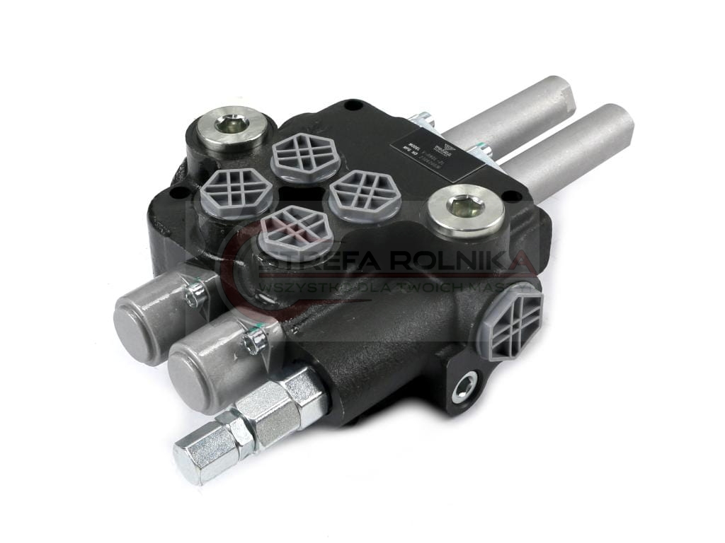 Rozdzielacz hydrauliczny 2-sekcyjny 80L sterowany joystickiem na linkę VOIMA - monoblokowy z układem równoległym z neutralną pozycją środkową. Olej w pozycji neutralnej krąży między pompą hydrauliczną a zbiornikiem.