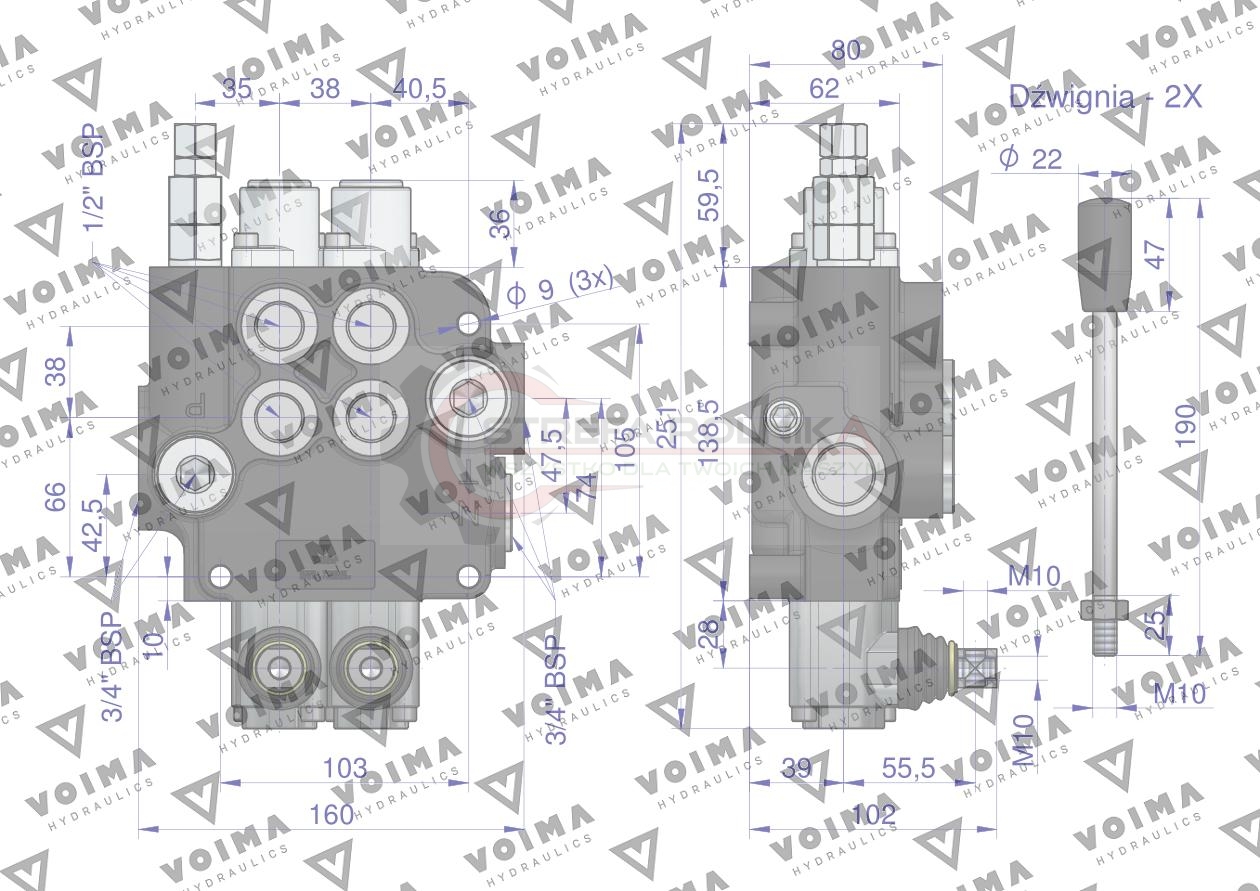 Rozdzielacz hydrauliczny 2-sekcyjny 80L z zatrzaskami VOIMA