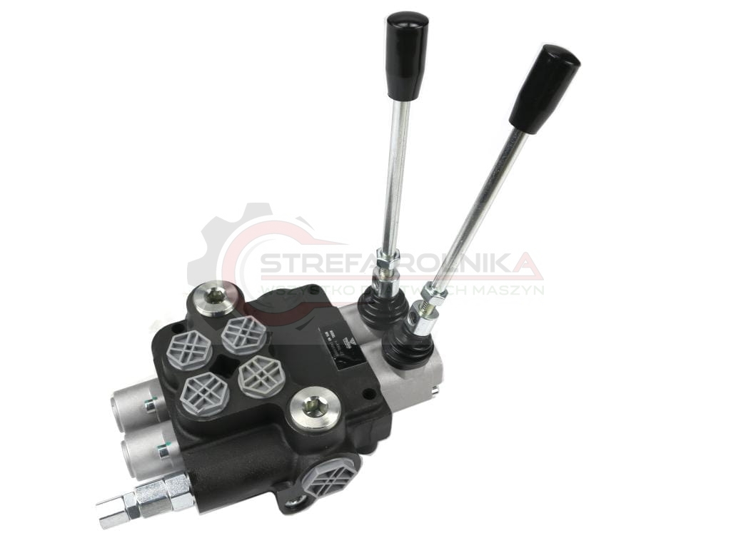 Rozdzielacz hydrauliczny 2-sekcyjny 80L z zatrzaskami na 2 sekcjach VOIMA - monoblokowy z układem równoległym z neutralną pozycją środkową. Olej w pozycji neutralnej krąży między pompą hydrauliczną a zbiornikiem.