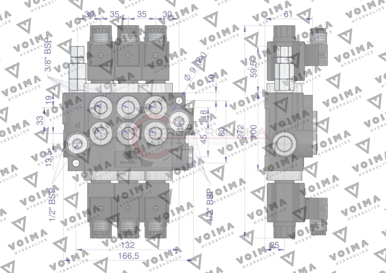 Rozdzielacz hydrauliczny 3-sekcyjny sterowany elektrycznie 12V 40L VOIMA - monoblokowy z układem równoległym z neutralną pozycją środkową. Olej w pozycji neutralnej krąży między pompą hydrauliczną a zbiornikiem.