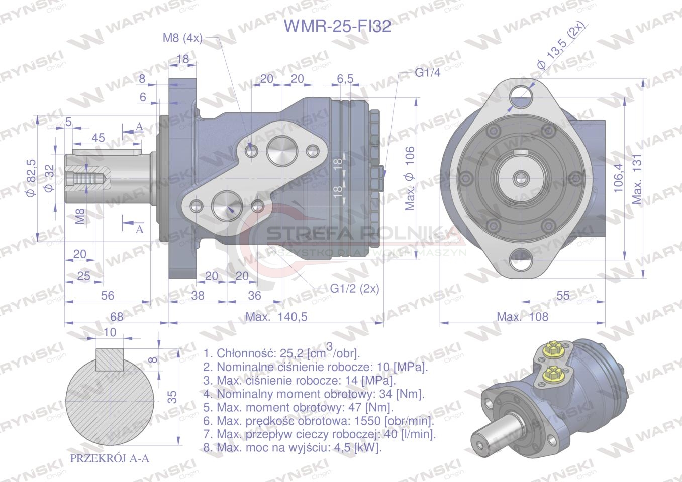 Silnik hydrauliczny orbitalny WMR 25 cm3/obr z wałkiem fi 32mm (100 bar / max.200 bar) Waryński. Silniki serii WMR mają lekką kompaktową konstrukcję, wysoki moment obrotowy. Możliwość połączenia równolegle lub szeregowo. W celu osiągnięcia dłuższej żywotności zaleca się, aby opytamalne waryunki pracy były na poziomie 1/3 do 2/3 parametrów maksymalnych.