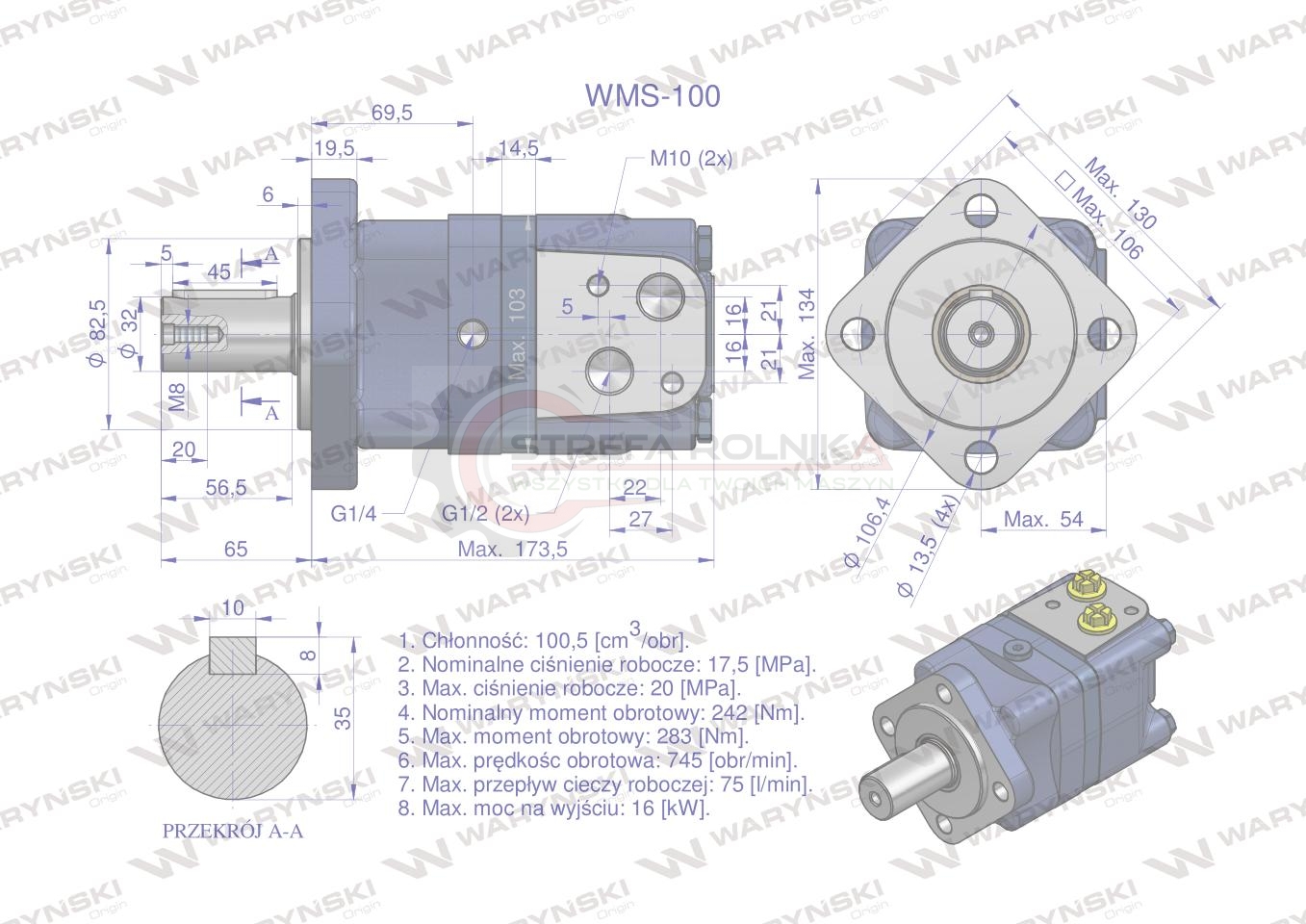 - Maks.Ciśnienie nomimalne: 17,5 MPa (175 bar) - Uwaga: maksymalne ciągłe ciśnienie pracy silnikaMPa (bar)
