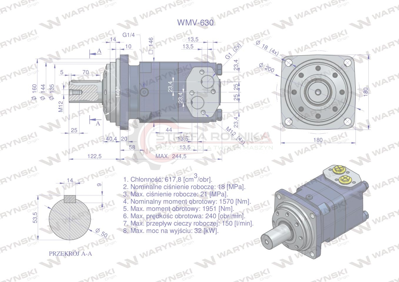 Silnik hydrauliczny orbitalny WMV 630 cm3/obr (180 bar / max.240 bar) Waryński