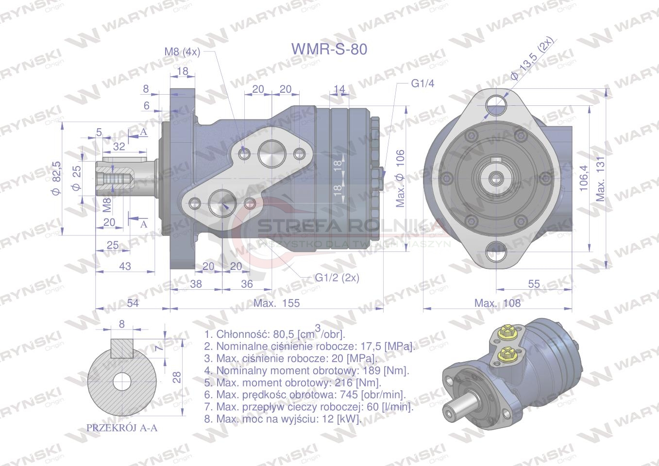 Silnik hydrauliczny orbitalny wzmacniany WMR-S 80 cm3/obr (175 bar / max.220 bar) Waryński