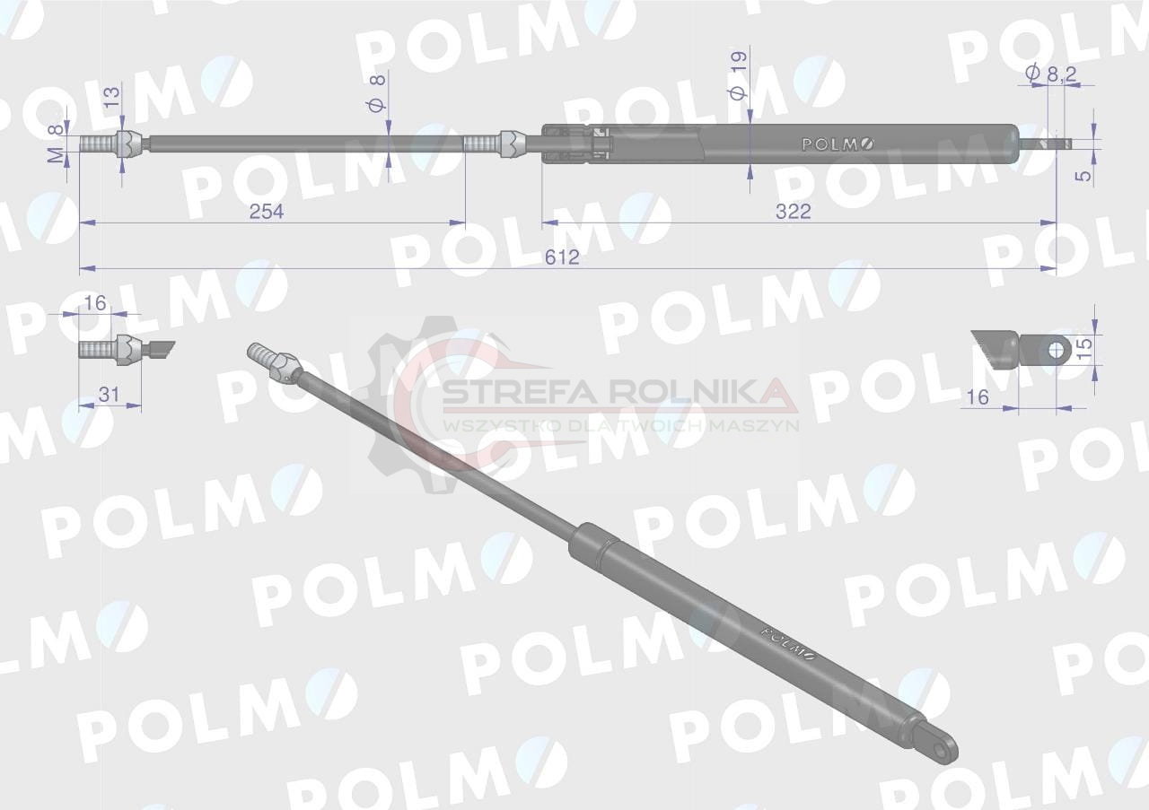 Siłownik szyby tylnej L max. 615mm 65421001 1-99-976-005 STEYR POLMO