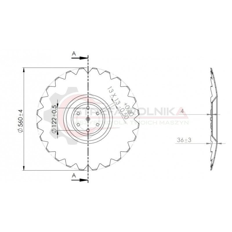 Talerz do agregatu talerzowego, przegięty TYP P, drobnoząbkowany 560 mm, 6 otworowy, grubość 4 mm