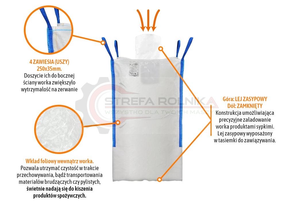 Worek BIG BAG 1000kg. z wkładem foliowym. 95 x 95 x 165. 4 uchwyty. Lej zasypowy / Dół zamknięty. Tasiemka /TEGER