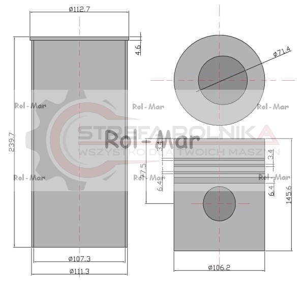 Parametry techniczne: Średnica wewnętrzna tulei: 107.3 mm Średnica zewnętrzna tulei: 111.3 mm Wysokość tulei: 239.7 mm Średnica kołnierza: 112.7 mm Wysokość kołnierza: 4.6 mm Średnica tłoka: 106.2 mm Wysokość tłoka: 145.6 mm Ilość pierścieni: 4 szt. Szerokość rowków pod pierścieniem: (od góry): 3.4/3.4/6.4/6.4 mm Odległość od środka sworznia do góry: 77.5 mm Głębokość komory spalania: 19.4 mm Średnica komory spalania: 71.4 mm