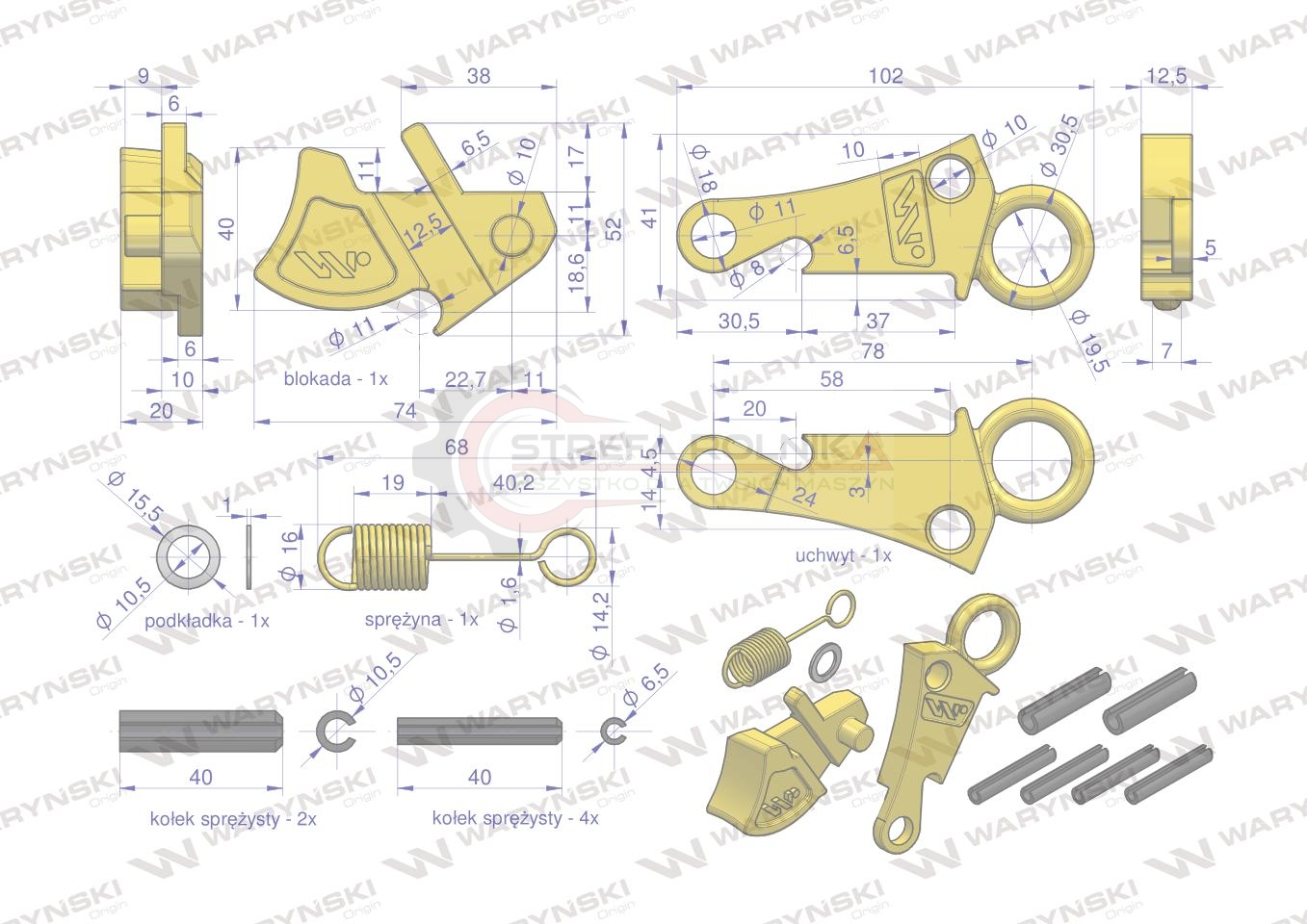 Zestaw naprawczy Haka sprzęgającego do spawania Waryński to nowa ulepszona konstrukcja zapobiegająca niepożądanemu wypięcia się kuli. Pewność połączenia ciągnika z maszyną potwierdzamy udzielając Żelaznej Gwarancji na ten produkt. Haki Waryński charakteryzują się: - Zwiększoną żywotnością poprzez ulepszone cieplnie łoże w miejscu współpracy z kulą, - Ułatwionym podpięciem maszyny, dzięki możliwości blokady mechanizmu, - Zwiększoną wytrzymałością mechanizmu blokującego, który został ulepszony cieplnie, - Ułatwionym montażem - optymalnie dobrany materiał -odpowiedni do spawania,