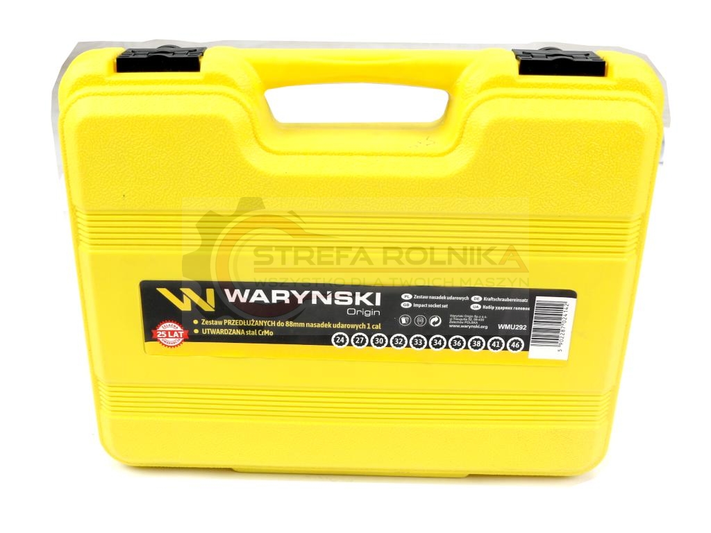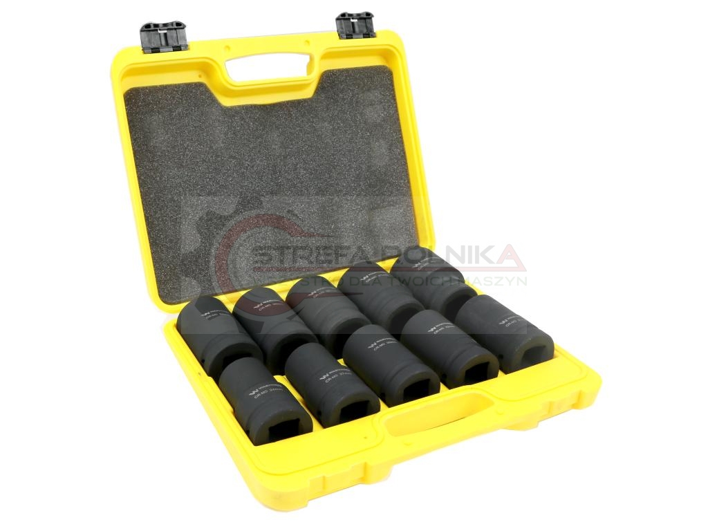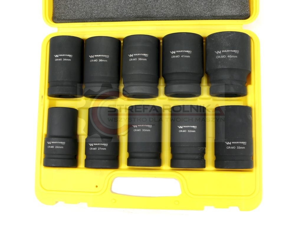 Zestaw nasadek udarowych długich 1" dwunastokątnych 10 nasadek rozmiary 24 27 30 32 33 34 36 38 41 46 mm ze stali CrMo DIN3129 Waryński Waryński